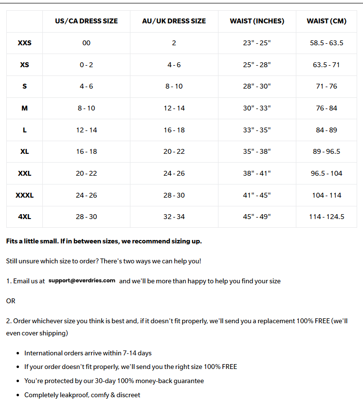 A: Everdries cover everywhere that needs to be covered and never let anything through